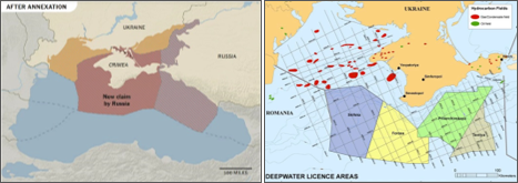 However, the test drilling for the corresponding development projects initiated by Ukraine in 2013 was interrupted by Russia’s annexation of the Crimean Peninsula, which is not internationally recognized. Since then, Russia has claimed not only the territorial waters belonging to Crimea but also large parts of the maritime territory belonging to Ukraine under the law of the sea. All the technologically advanced drilling platforms that had been erected for test drilling were militarily occupied. The maps illustrate the extent of the sea area controlled by Moscow since then (left) and the gas explorations annexed by Russia (right).